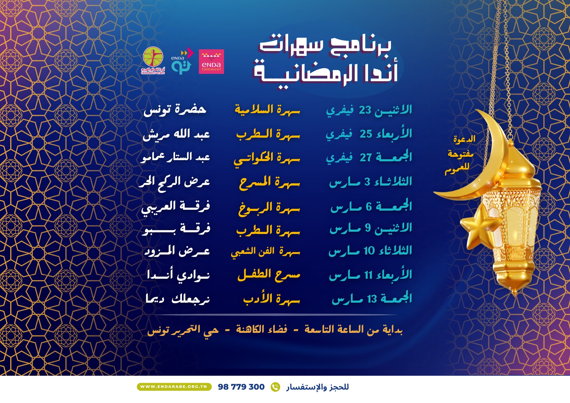 Fidèle à sa mission de proximité et d’inclusion, Enda Inter-arabe transforme cette année encore l’Espace El Kahina en un véritable carrefour de partage. Nous vous invitons à découvrir une programmation où la culture n’est plus un luxe, mais un droit accessible à chaque citoyen.